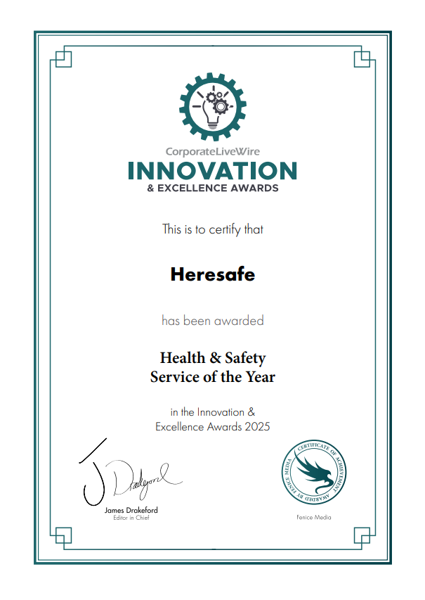 Heresafe is proud to announce that we have been named Health and Safety Service of the Year at the 2025 Corporate LiveWire Innovation and Excellence Awards. This achievement recognises our commitment to helping organisations protect their people, streamline compliance and create safer working environments through smarter contractor and visitor management.