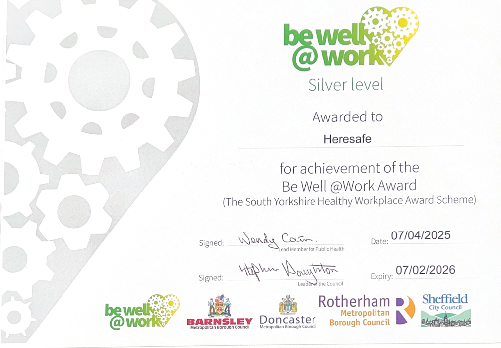 Heresafe is proud to have achieved the Silver level in the Be Well @ Work Award, a South Yorkshire programme that recognises employers who actively support health, wellbeing and positive workplace culture.